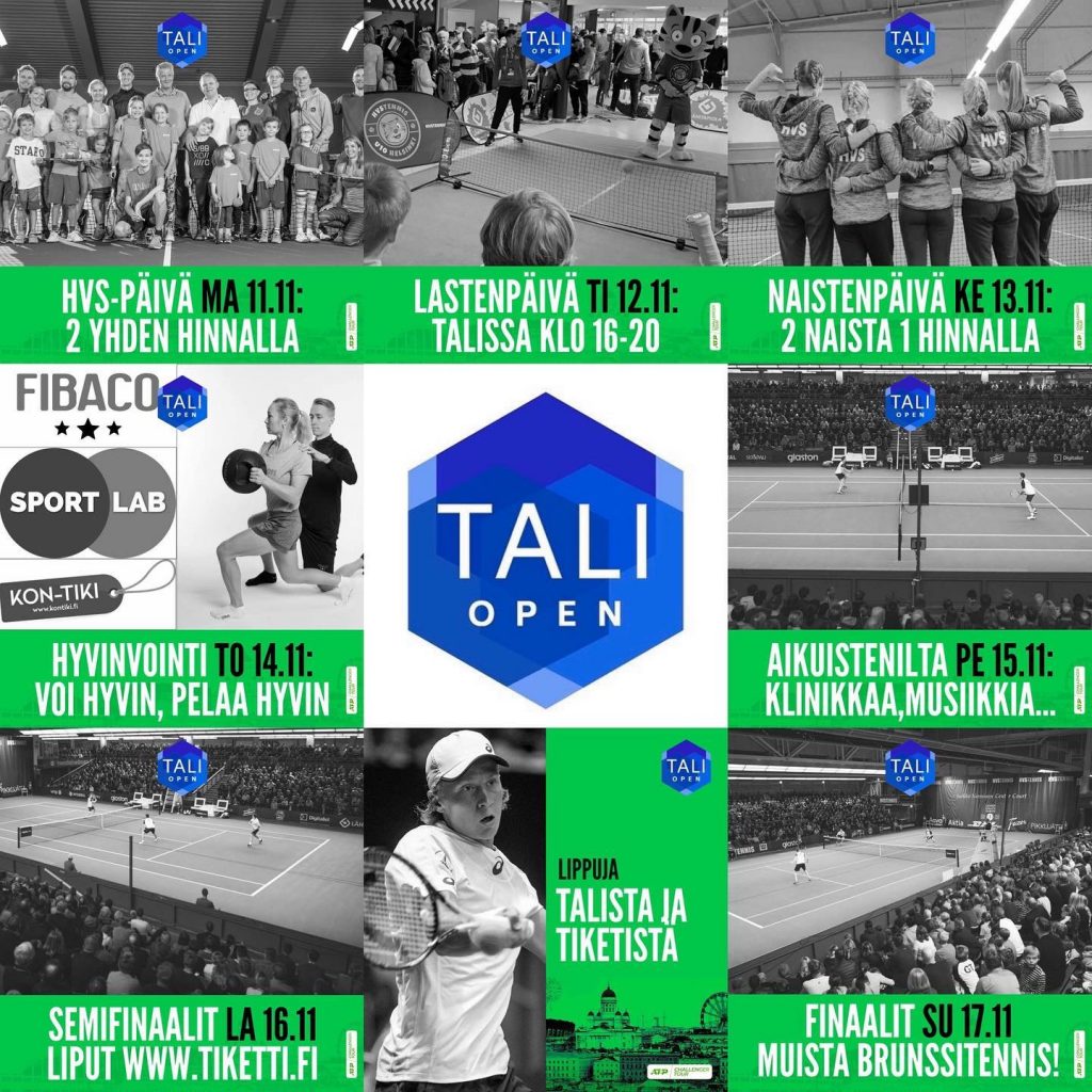 Kaksin- ja nelinpelin finaalit. Aloita Tali Open -finaalisunnuntai reippaasti osallistumalla Brunssi-turnaukseen by HVS! Brunssitenniksessä (klo 9.00-11.00) pelataan nelinpelejä tasoryhmissä sekä mahdollisuuksien mukaan myös kaksinpelejä. Pelien jälkeen nautitaan yhdessä virkistävä brunssi klo 11.15, jonka jälkeen siirrytään katsomaan Tali Openin korkeatasoisia finaaleja. Ilmoittautuminen Brunssitennis + finaalit: www.hvstennis.fi/kauppa
